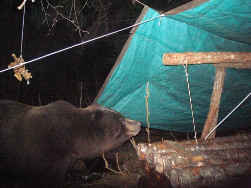 ADF&G wildlife technician Jeff Jemison aimed a remote trail camera at the carcass of a dead moose north of Juneau in the spring of 2010 and drew in a bear that had recently emerged from hibernation. -